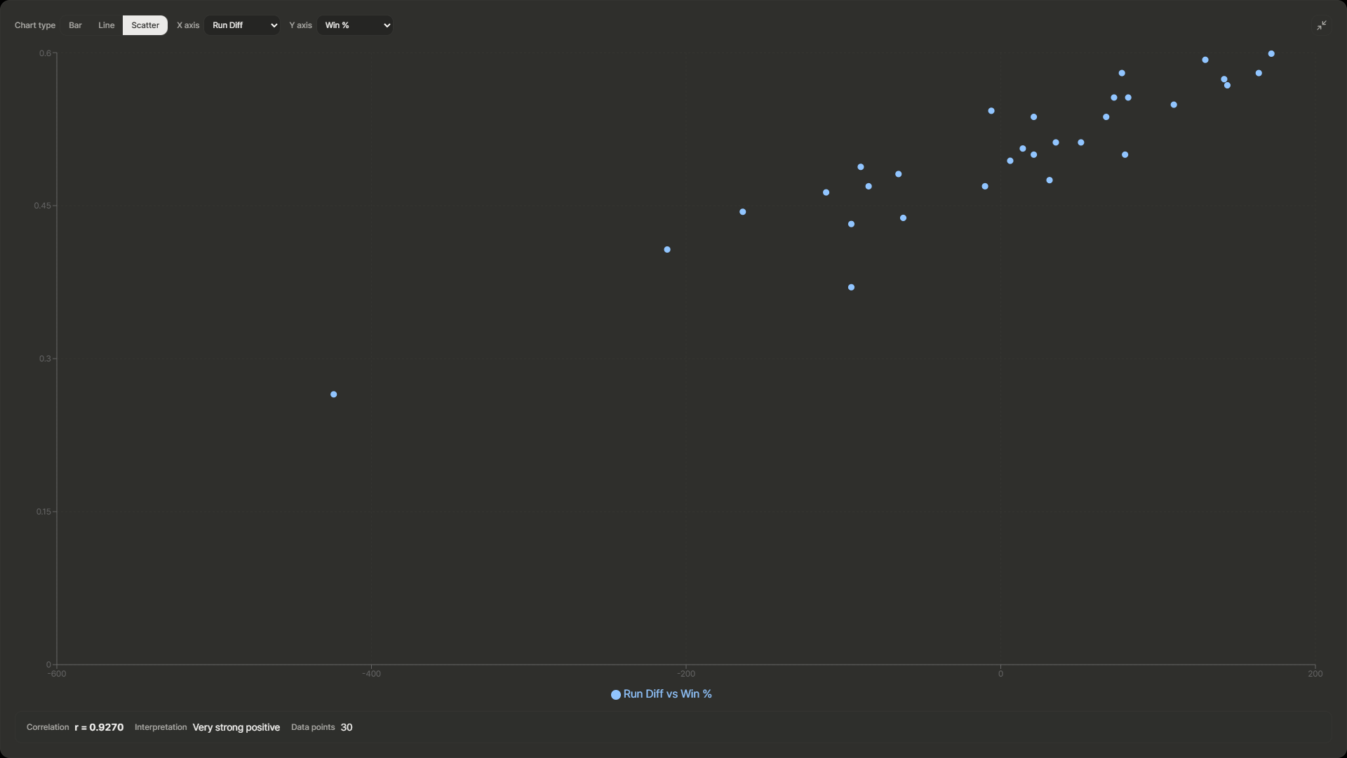 득실차(X축)와 승률(Y축)을 점으로 찍으니, 점들이 왼쪽 아래에서 오른쪽 위로 흘렀다. "관계가 있구나"라는 느낌은 확실히 왔다.