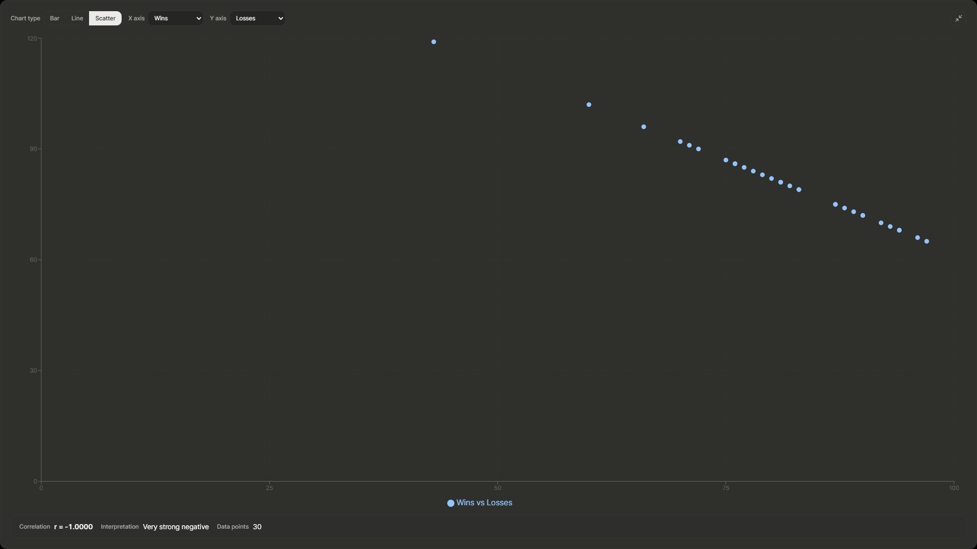 - 승수(W) vs 패수(L): r이 -0.9 근처. 당연하다. 이기면 덜 지고, 지면 덜 이긴다.
